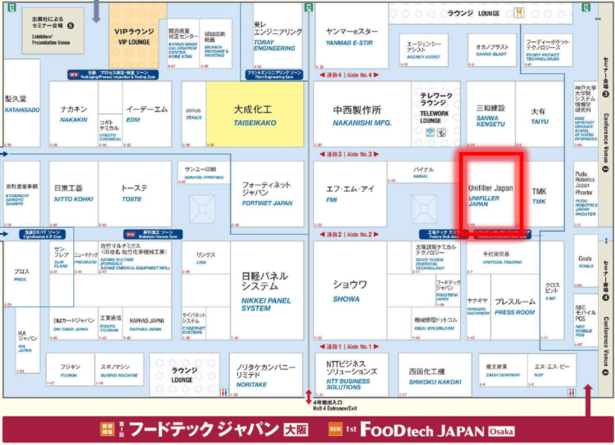 今回はフードテックジャパンとしては初めての大阪での開催となり、大阪南港コスモスクエアにある日本最大級の国際見本市会場「インテックス大阪」が会場として選ばれました。他にも多くの展示会が開催され、食品関連事業の展示会であるフードテックは4号館での開催となりました。