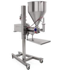 40mlから2,750mlまで幅広く大量充填できる、本体が昇降する充填機です。本体を下げてホッパーへの投入が簡単に行えます。また、好みの高さに調整できるので快適に作業することが可能です。