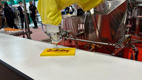 コンベヤで運搬されてくる製品に対し自動で追従しながら充填するデモをBAKER-BOTが実演し、沢山の方からお褒めの言葉を頂くことが出来ました。協働ロボットは各種食品製造機械との相性が大変良く、状況や環境に応じて様々なスタイルを提案できることが強みでもあります。