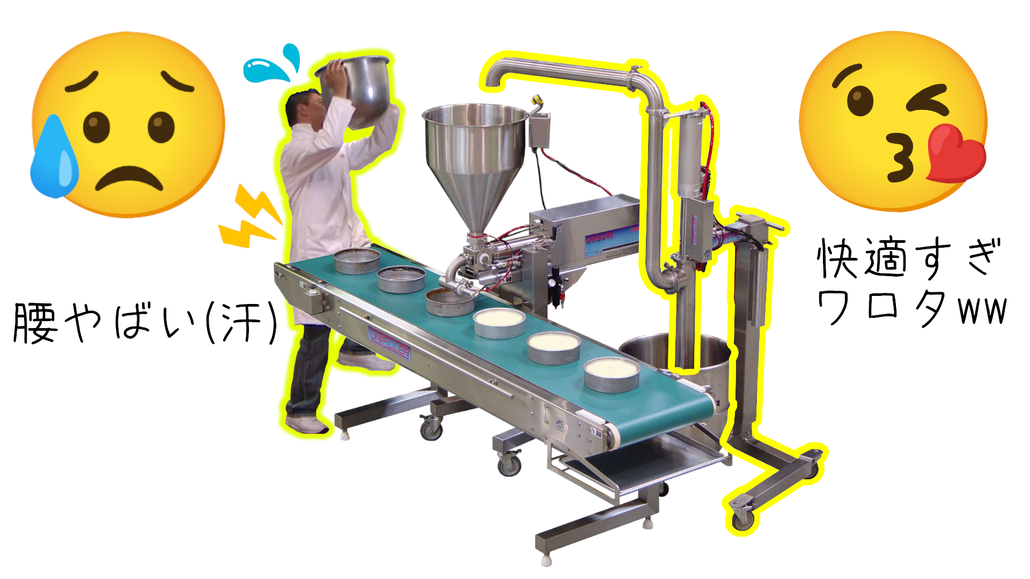 HopperTopperは、ボウルやバケツ等からの食材を充填機のホッパーへと自動搬送するポンプです。例えば、ケーキの生地やクリームを容器に充填する機械のホッパーへの食材補充作業を、この機械によって自動化することができます。ホッパーへの食材補充作業…かなり大変ですよね(汗)。高いところにある場所にいれるので重労働ですし、食材がこぼれてしまうリスクもあります。そして、万が一の転倒や転落による労災のリスクも無視できません。