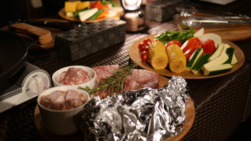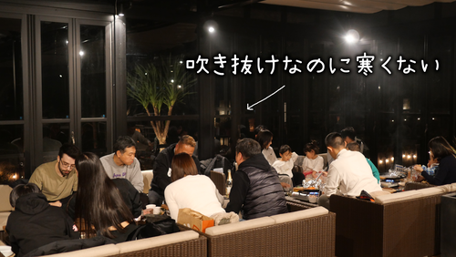 グランピング施設を散策しているころ、ついに福岡事務所と東京事務所のメンバー&ご家族が合流しました。久しぶりに会うメンバーもおり、非常に胸アツな再開のひとときとなりました。そして、あたりが暗くなってきたころ、各事業所メンバー&ご家族の皆様とともに、厳選された和牛BBQとシャンパン(※大和ハウジング様ありがとうございます!!)で最高のディナーのスタートです!