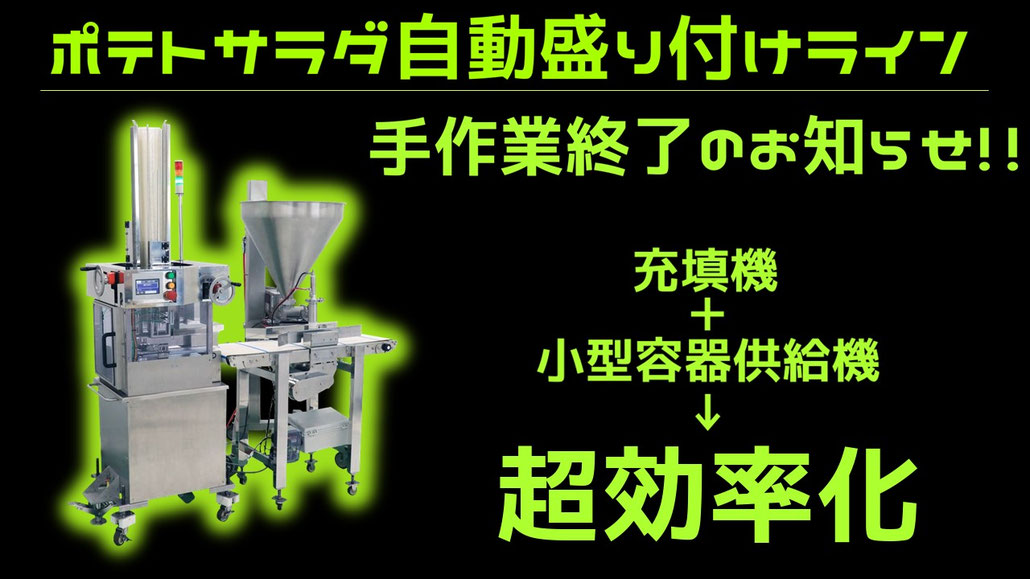 このたび、不二精機株式会社様のご協力のもと、省人化及び高効率化のための”ポテトサラダ自動盛り付けライン”を取り扱う事になりました。これから新規導入をご検討のお客様のみならず、既に弊社機械を使用されており更なるステップアップをご検討のお客様に対しても、絶対の自信をもってご紹介させていただきたいシステムとなります。