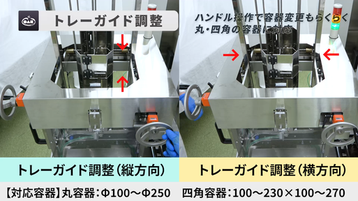 トレーガイドを調整する事により、様々な種類の容器に対応可能です。これ一台で様々な製品に対してフレキシブルに対応出来る万能型ラインとなっております。また、調整方法も非常にシンプルですので、調整に時間を取られる事はありません。製品や容器の切り替えを迅速に行う事で、業務効率は格段に向上します。