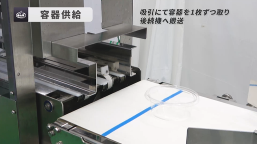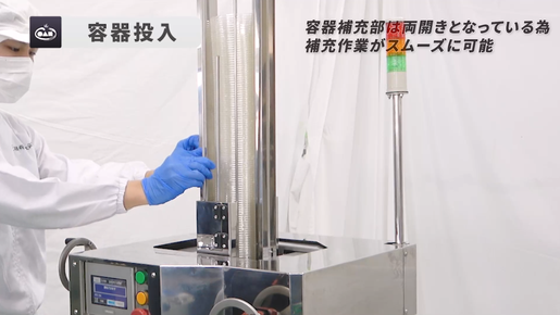 様々な製品に対応していても、容器の投入に時間を取られていては意味がありません。容器補充部は作業される方がスムーズに容器を補充できるような工夫が施されております。これにより長時間の連続生産が可能となります。さらに補充部は両開きとなっており、容器にトラブルが発生した際も迅速に対応する事が出来ます。